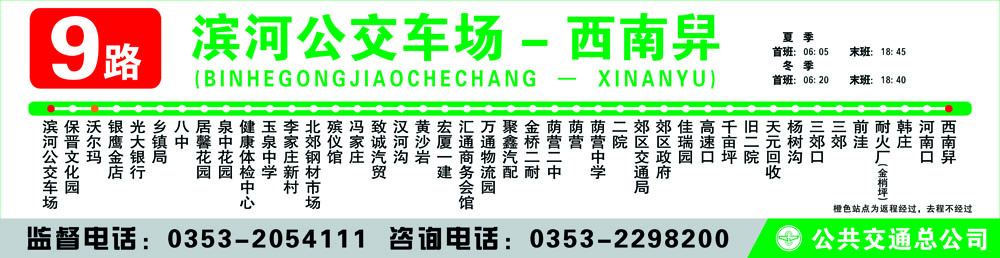 濱河公交車場 - 保晉文化園 - 銀鷹金店 – 光大銀行 - 鄉(xiāng)鎮(zhèn)局 - 八中 - 居馨花園 – 泉 中花園 - 健康體檢中心 - 玉泉中學(xué) - 李家莊新村 - 北郊鋼材市場 – 殯儀館 - 馮家莊 – 致誠汽貿(mào) - 漢河溝 - 黃沙巖 - 匯通商務(wù)會館 - 萬通物流園 - 聚鑫汽配 - 金橋二耐 - 蔭營二中 - 蔭營 - 蔭營中學(xué) - 二院 - 郊區(qū)交通運輸局 - 郊區(qū)政府 - 佳瑞園 - 高速口 - 千畝坪 - 舊二院 - 天元回 收 - 楊樹溝 - 三郊口 - 新世紀(jì) - 三郊 - 前洼 - 耐火廠(金梢坪)- 韓莊 - 河南口 - 西南 舁 - 五里莊 - 雨下溝